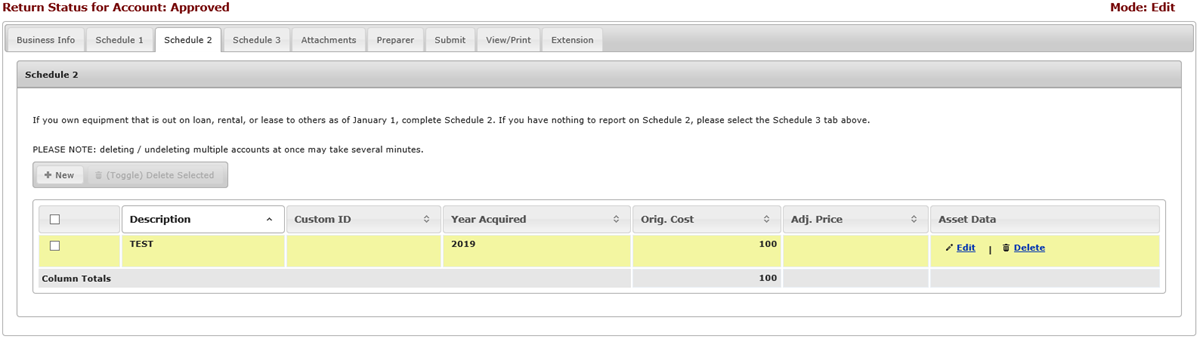 If you own equipment that is out on loan, rental, or lease basis to others as of January 1, complete Schedule 2 (shown below). Use the New button to add new items, the Edit button to edit an item, and the Delete button to delete an item. The column headings with double arrows are sortable, and can be sorted by clicking on the column heading. Clicking a second time will reverse the sort order. The currently sorted column's heading will be highlighted white, and the arrow will change to a single arrow indicating the sort direction.