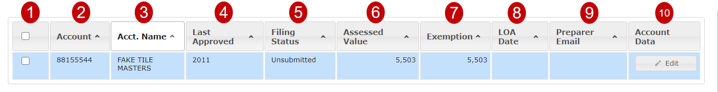 Column 4: Last Approved Indicates the most recent tax year the account had a return processed by the PCPA.
